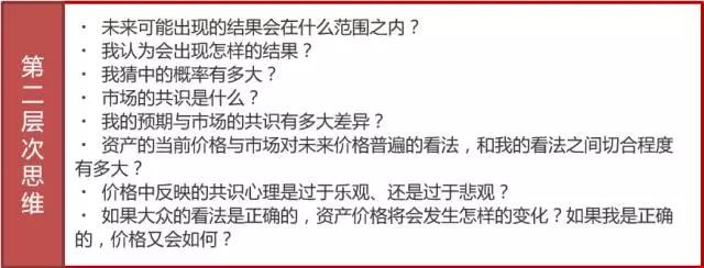 第一層次思維單純而膚淺,幾乎人人都能做到。第一層次思維者所需的只是一種對(duì)于未來的看法,譬如“公司的前景是光明的”。第二層次思維深邃、復(fù)雜而迂回。第二層次思維這要考慮許多東西:
